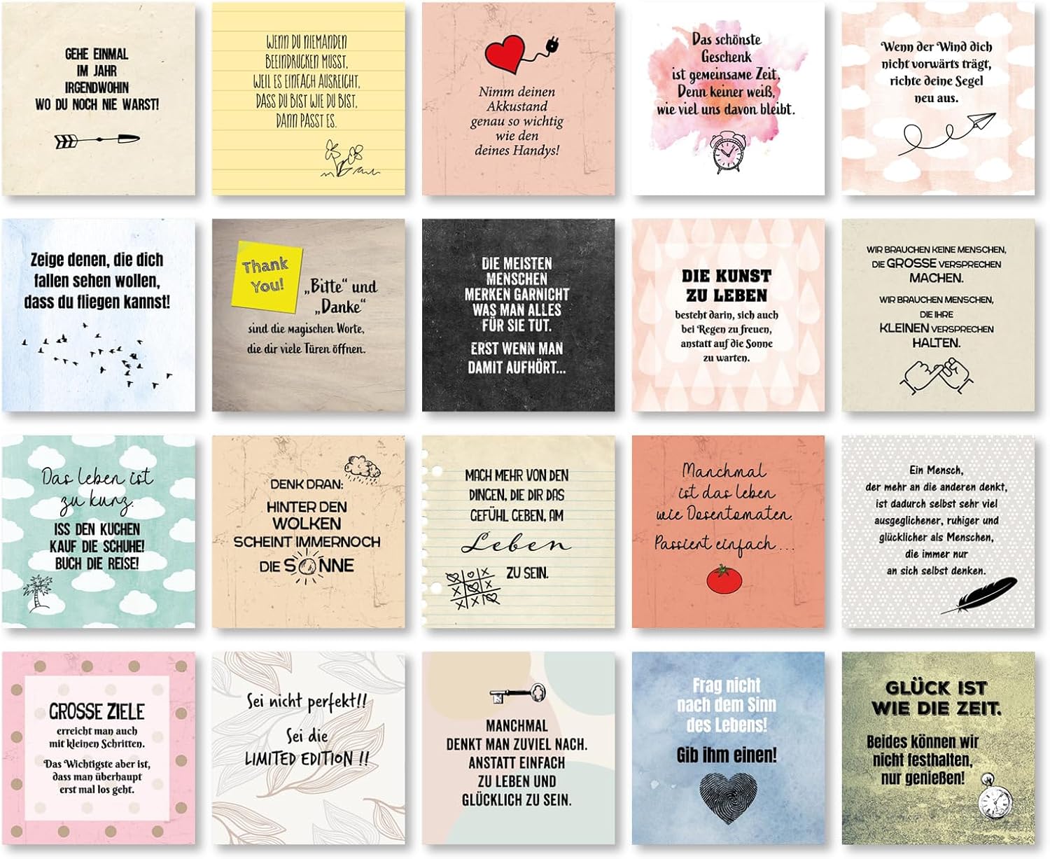 - PRAKTISCH UND HANDLICH: Handliches quadratisches Format 10,5 x 10,5 cm, beidseitig mit insgesamt 50 Sprüchen versehen.