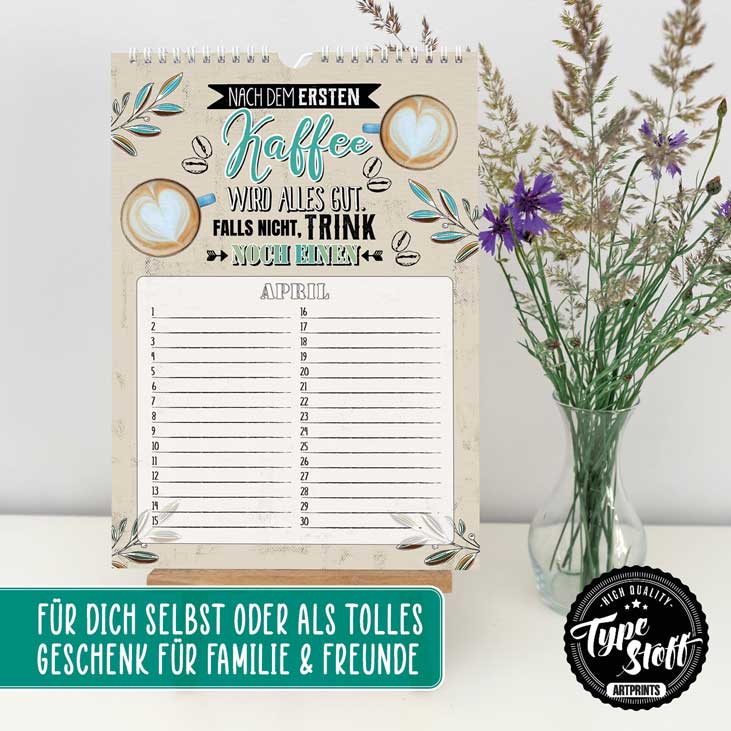 Extra stabile Qualität: ein Deckblatt, zwölf Monatsblätter und ein Rückblatt, gedruckt auf hochwertigem 250 gr/qm-Bilderdruckpapier. Format DIN A4 mit Spiralbindung und Aufhänger.