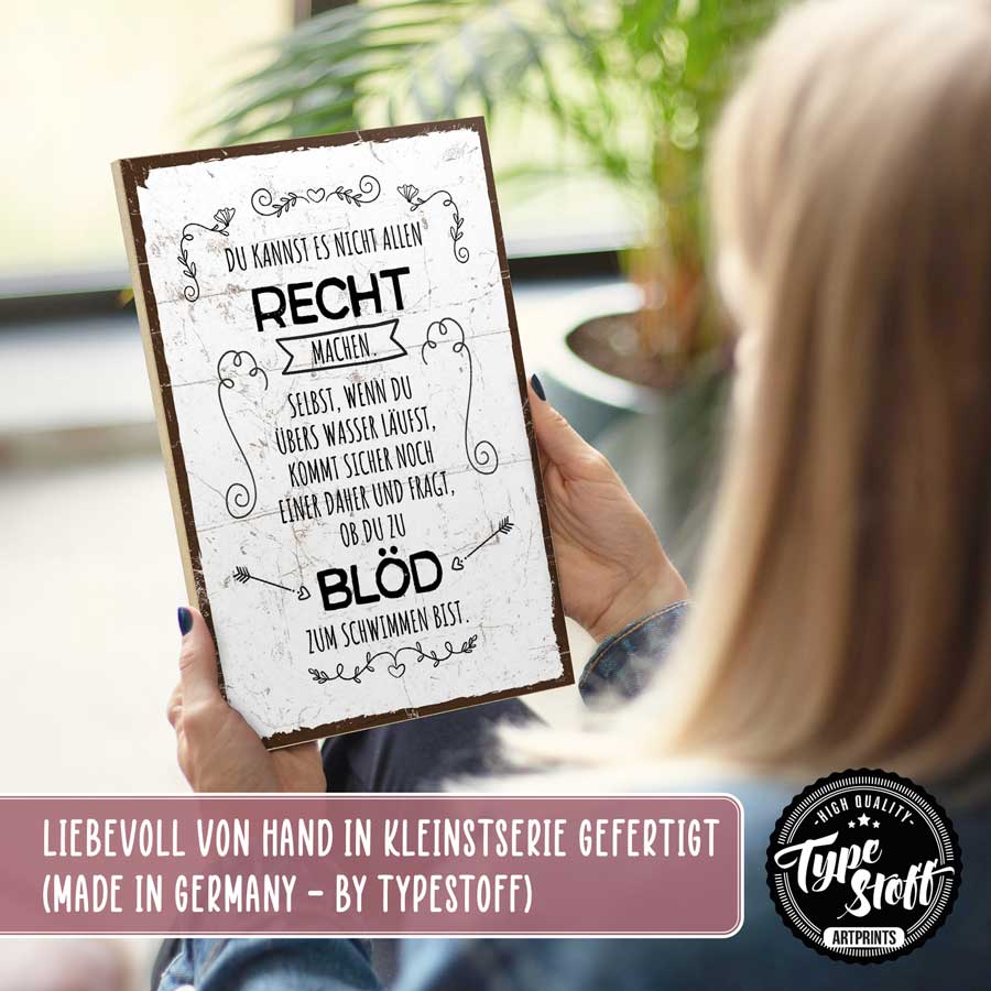 Holzdeko-Schild als Geschenk und Dekoration. Liebevoll von Hand in Kleinstserie gefertigt. Das Schild ist aus 10 mm dicker, stabiler MDF-Holz-Platte gefertigt mit foliertem Print. Mit rückseitig eingelassenem Aufhänger und geschliffenen, hellen Kanten, toll als Wanddekoration.